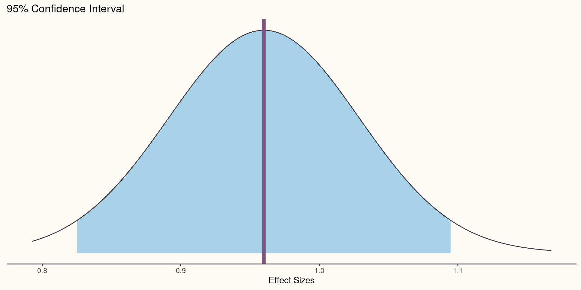 Confidence interval: A range of effect sizes whose tests produced \(\text{P Value}\gt .05\) and thus are considered to be more compatible with the data compared to effect sizes outside of the interval GIVEN that the model and its assumptions are all correct.