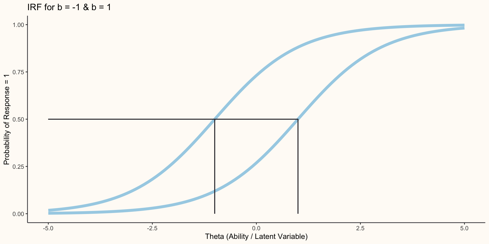 b is the difficulty parameter, it tells us how difficult the item is (for cognitive tests) or what level of theta is needed (attitude measurements) for an individual to respond 1 to the item: