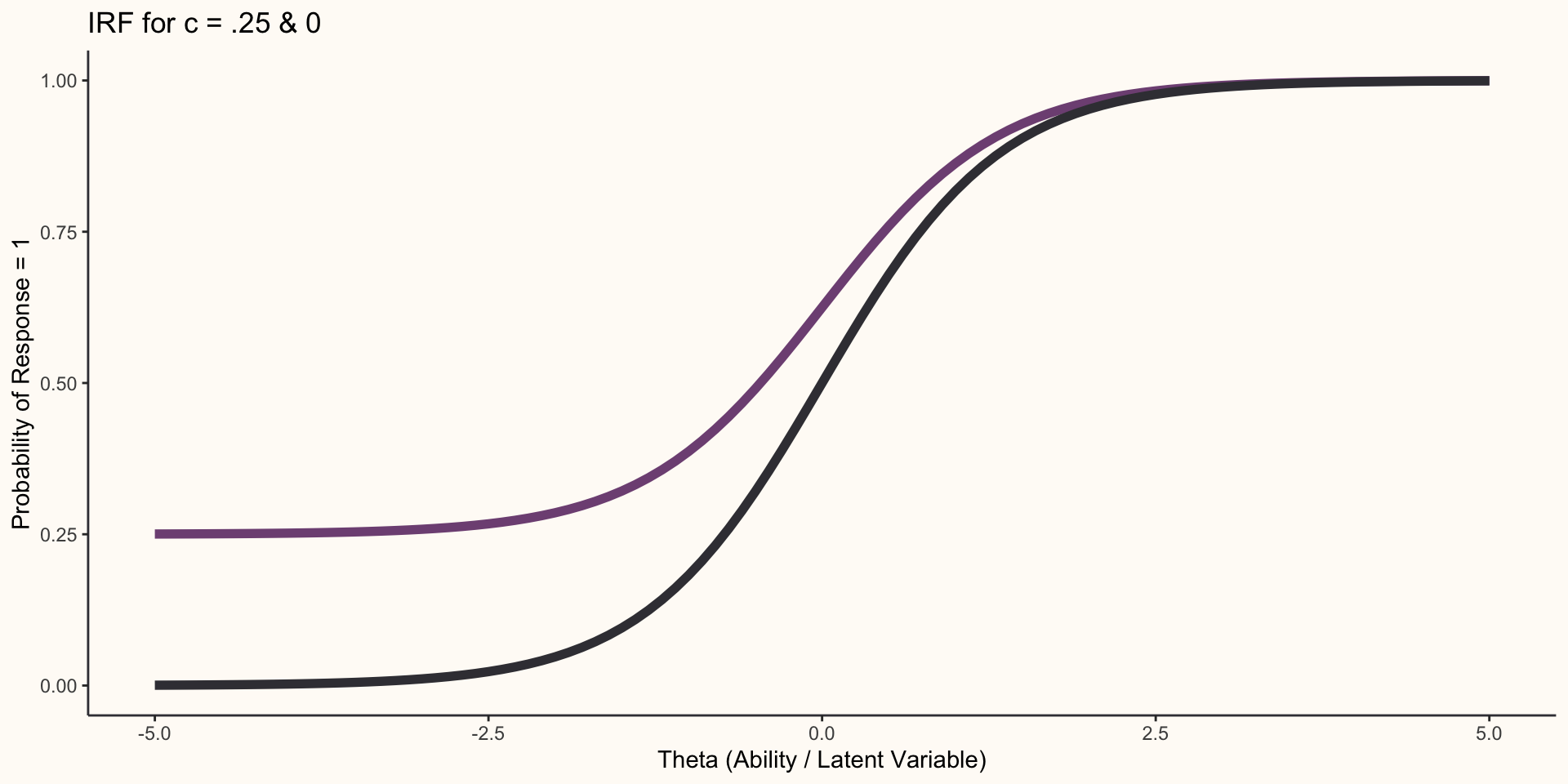 \[P(X = 1)=c_{j} + (1 - c_{j})\frac{1}{1 + e^{-a_{j}(\Theta_{i}-b_{j})}}\]