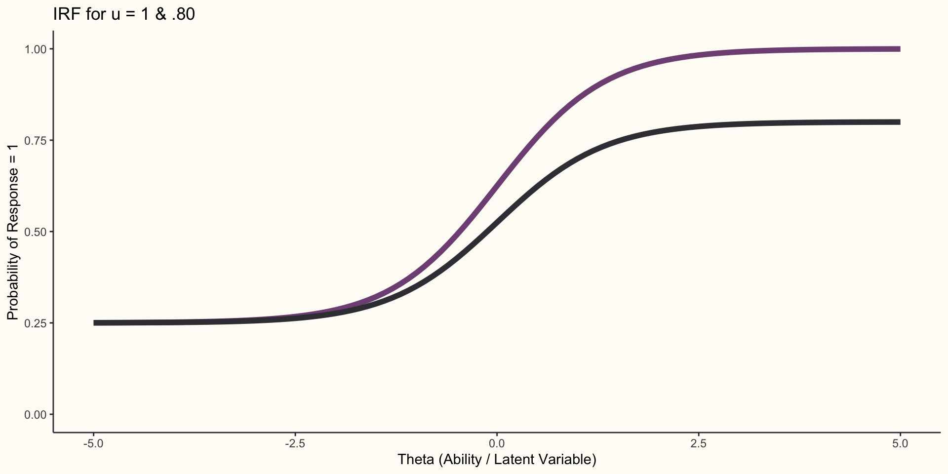 \[P(X = 1)=c_{j} + (u_{j} - c_{j})\frac{1}{1 + e^{-a_{j}(\Theta_{i}-b_{j})}}\]